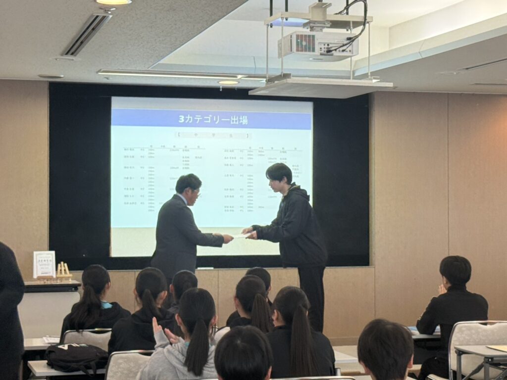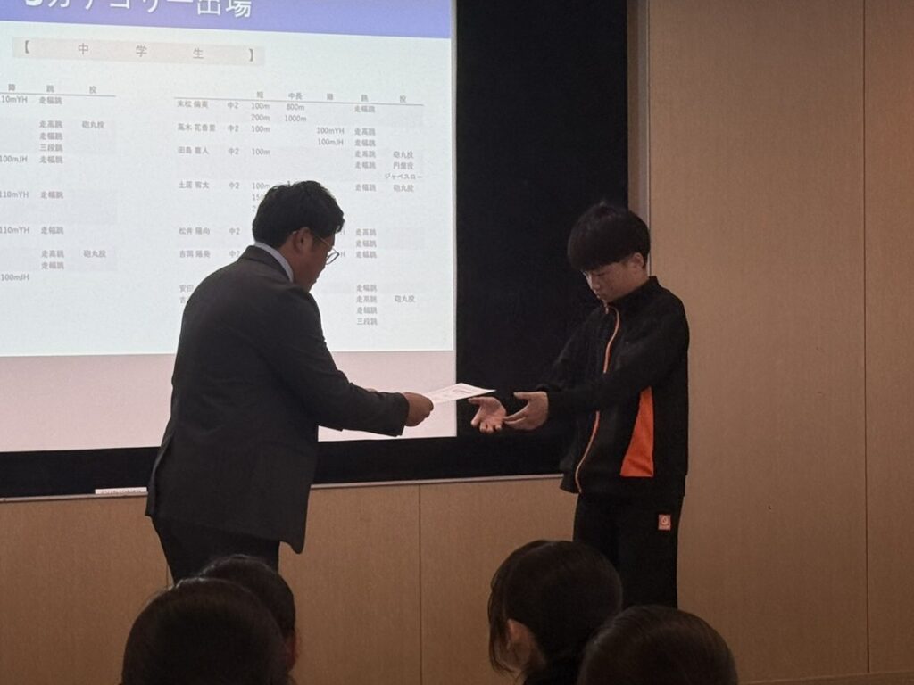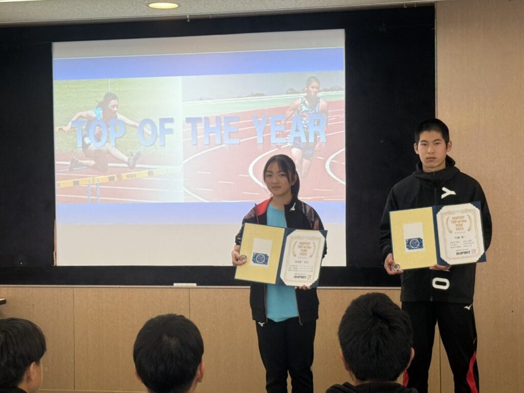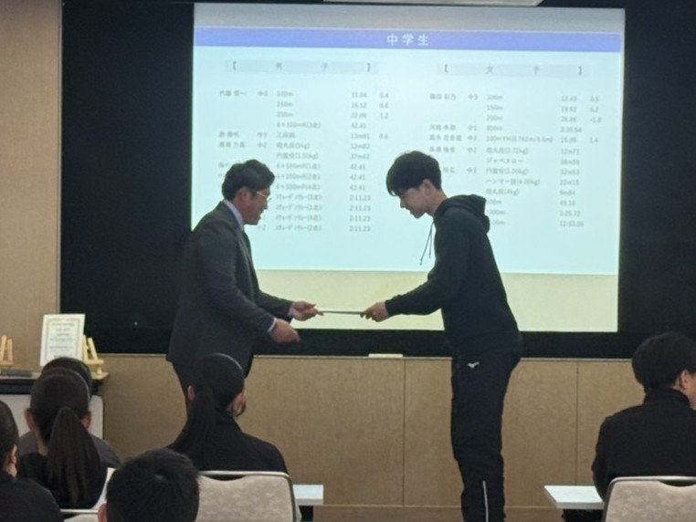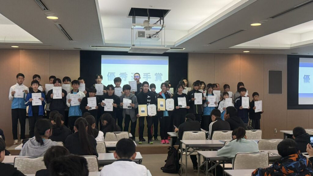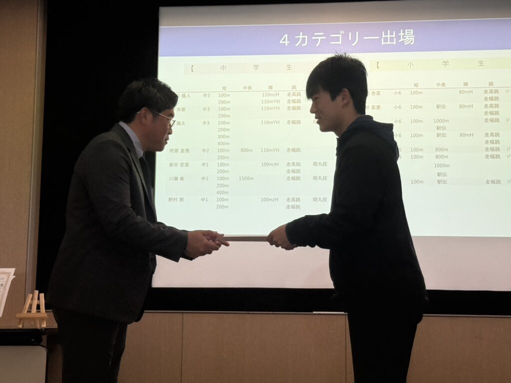 全日本マスターズの優勝者2名に加え、小学生の全国大会出場者、そしてU16陸上での入賞、出場者に加え、今年は何と言ってもメモリアルセンターで行われたU16リレーでの5位入賞のメンバーが表彰されました。