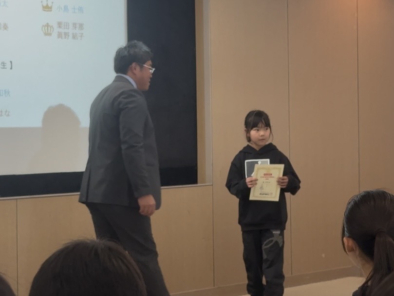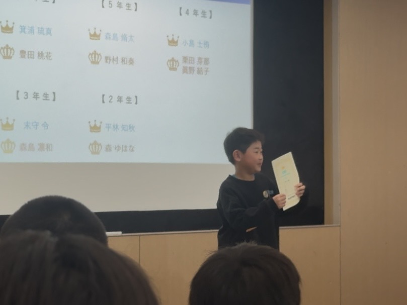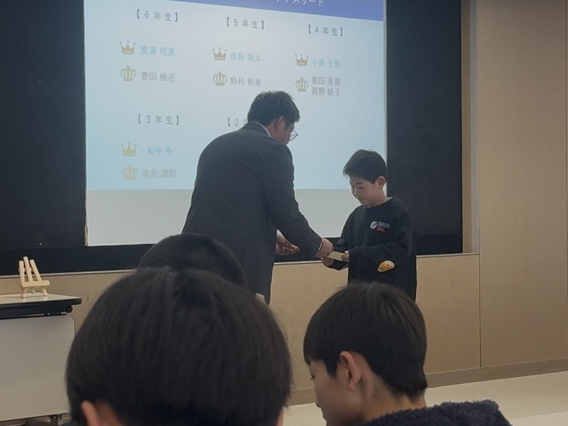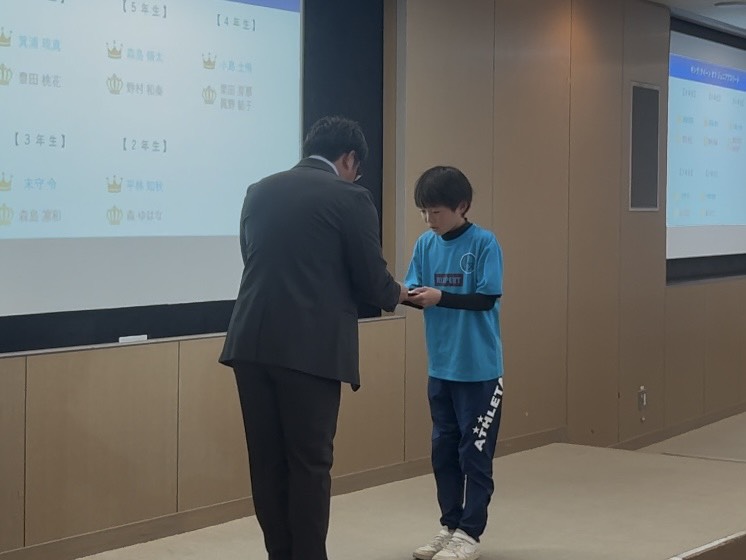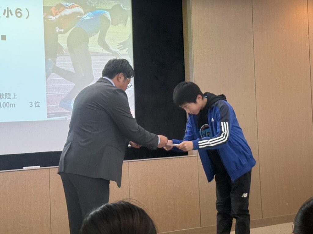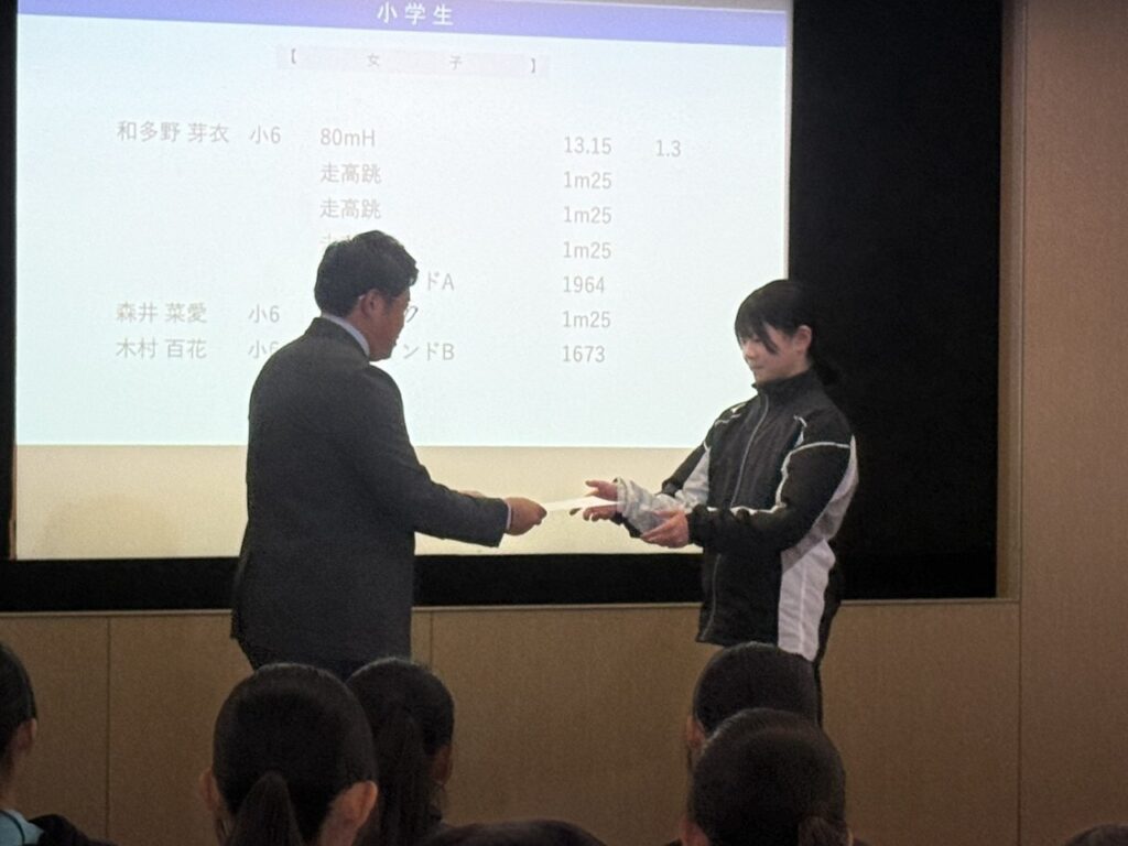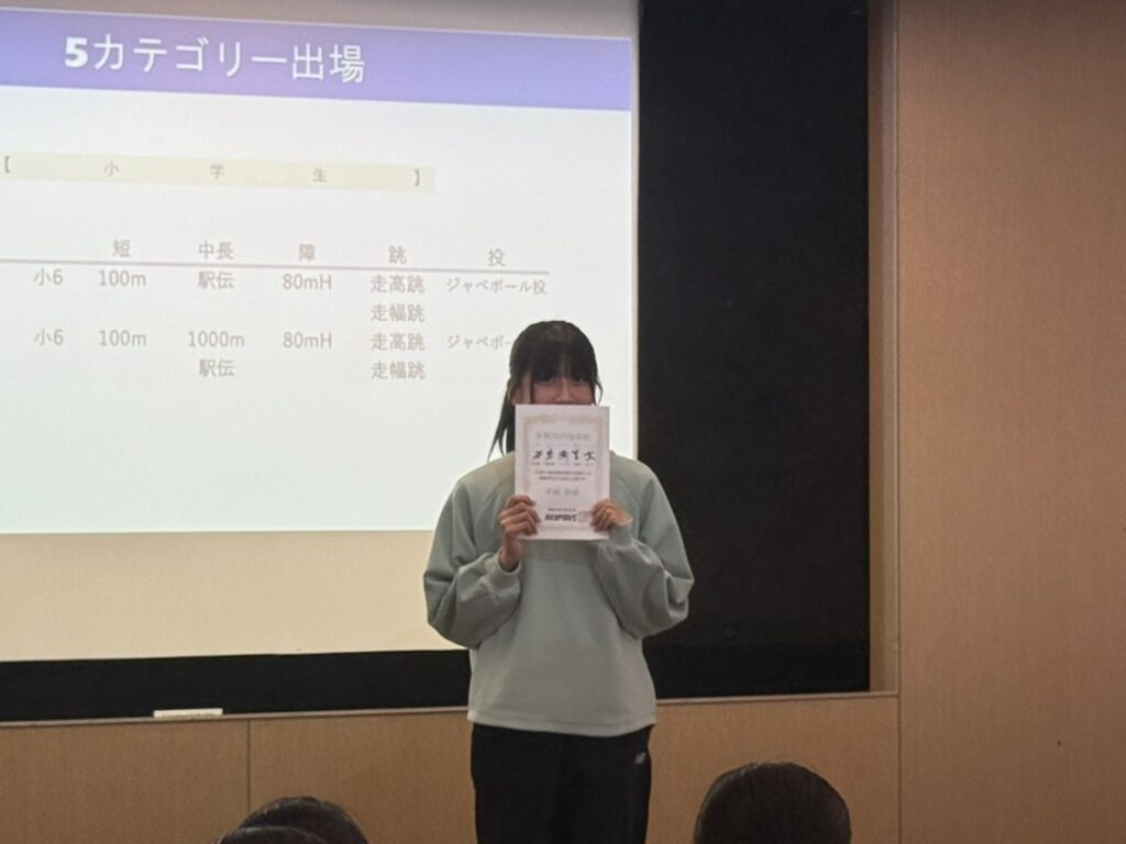 水曜・木曜のジュニアの活動では年間を通して50m、50mH、800m、走幅跳、走高跳、ジャベボール投の6種目に挑戦し記録を残してきました。ここでは各記録を得点化し、1~6年生の各学年男女での合計得点最高者を表彰対象としました。年間を通してジュニアの活動に参加してもらえたお礼も含め、賞状と優勝選手と同じレアな缶バッジを贈呈しました。