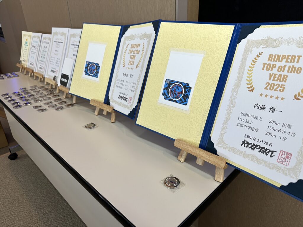 RIXPERTから陸協登録をした小学生、中学生以上の選手の中で、最も顕著な活躍が認められる選手に送られる賞となります。今年は小学生選手権にてコンバインドAで優勝した小6女子選手、全中陸上、国スポ、U16陸上に個人種目で出場した選手に、豪華仕様の賞状と副賞としてRIXPERTデザインのオリジナルクオカードが贈呈されました。
