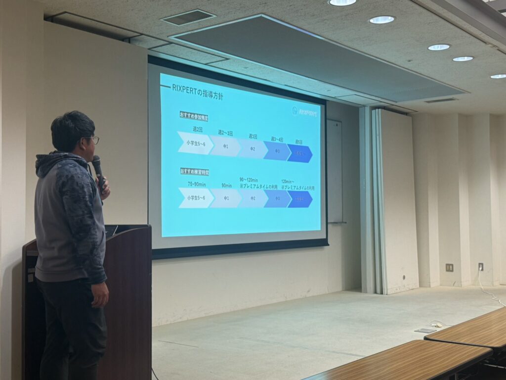 RIXPERTの設立背景から始まり、長期的な視点での育成を目指す指導方針の確認、そして全国平均を大きく上回る記録の伸びとそれを支える分析を中心としたフィードバックシステムについて説明がされました。