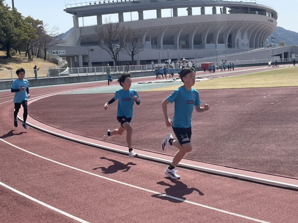 記録の集計中に行った800mでは5年生男子選手が積極的に前を引っ張り、2分40秒を切るタイムでゴールしました。