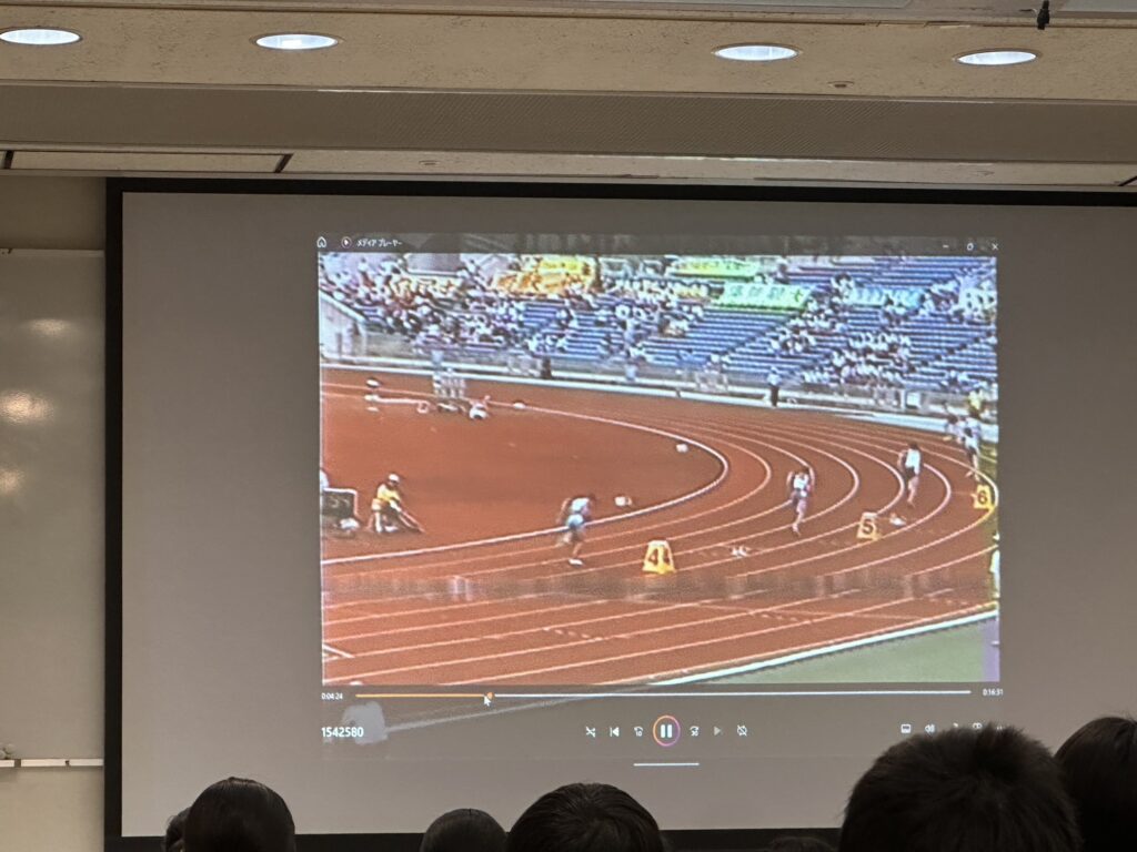 海外の研究論文をベースに、世界一流選手のスロー動画や自分たちの走りの動画を見ながら、速く走るために着目するべきポイントについて説明を進めていきました。途中ではAmazonで購入した実物のムチを振る姿も交えながら接地に対する理解を深めました。