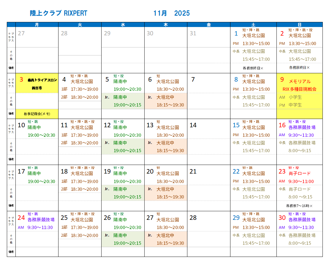 • 11/9(日)はメモリアルセンター補助競技場で午前が小学生、午後が中学生の多種目挑戦会を行います。詳細は別途ご案内します。