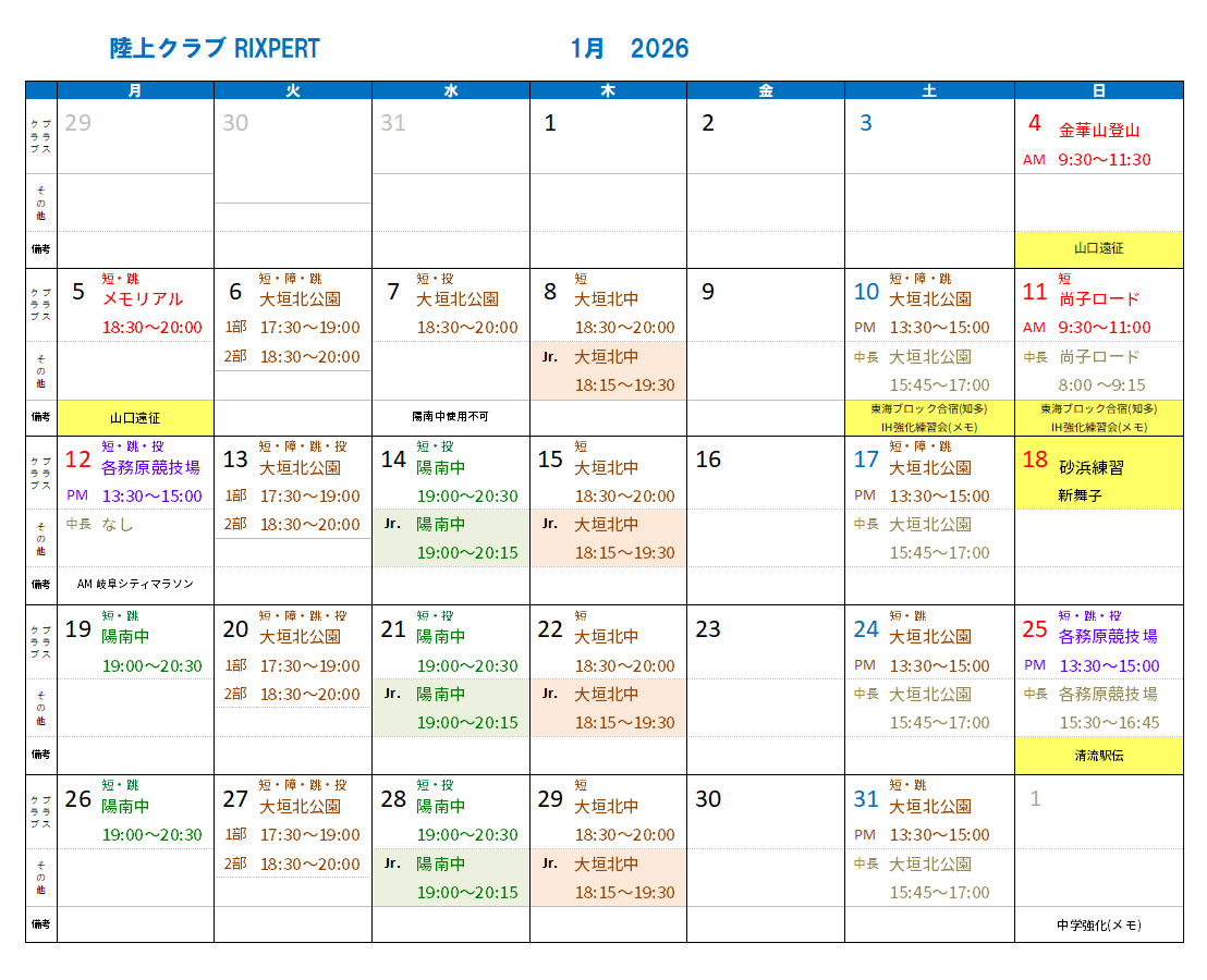 • 1/11(日)は長良橋のたもとの尚子ロードで活動します。投てき練習は行いません。