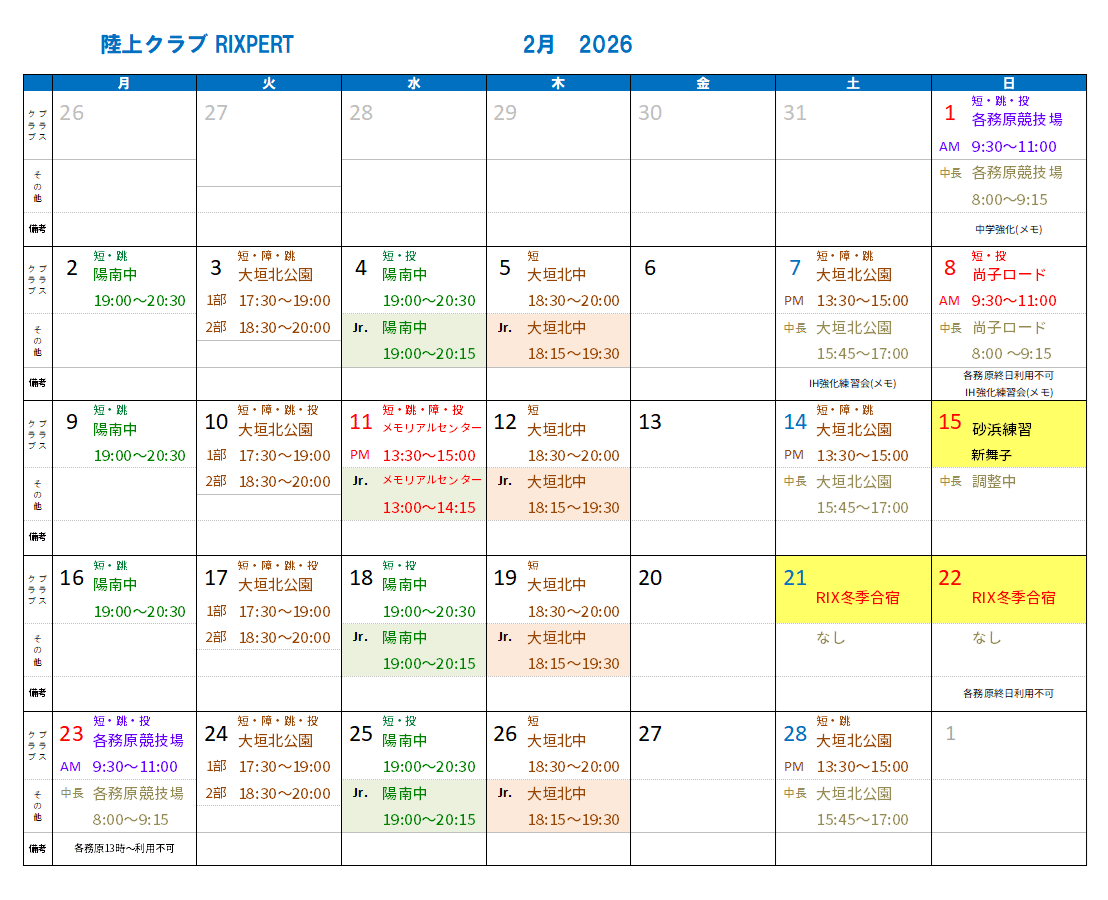 • 2/11(水)はハードル、投てきは13:00~15:00にて特別練習を行います。プレミアム利用者は15:30までの活動となります。
