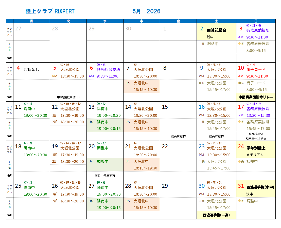 • 火曜日の1部の時間はクラブ・ジュニアプラス参加者の基礎トレーニング部門となります。専門種目の練習は行いません。